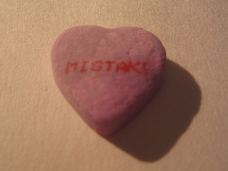 I wanted to post this earlier, in a more relevant time frame, but I had to make sure Erin got her Valentine's day present first. Part of her present involved the reification of several many of these little Valentine's Day Hearts. So I got a good chance to catalogue the gamut of possible witticisms that can appear on each candy. This example was singular. Imagine two lovers trading hearts, the little sayings on each one drawing them closer together. "Be Mine," says hers. "You're Special," says his. Then this heart is drawn. Things can only get ugly from there.